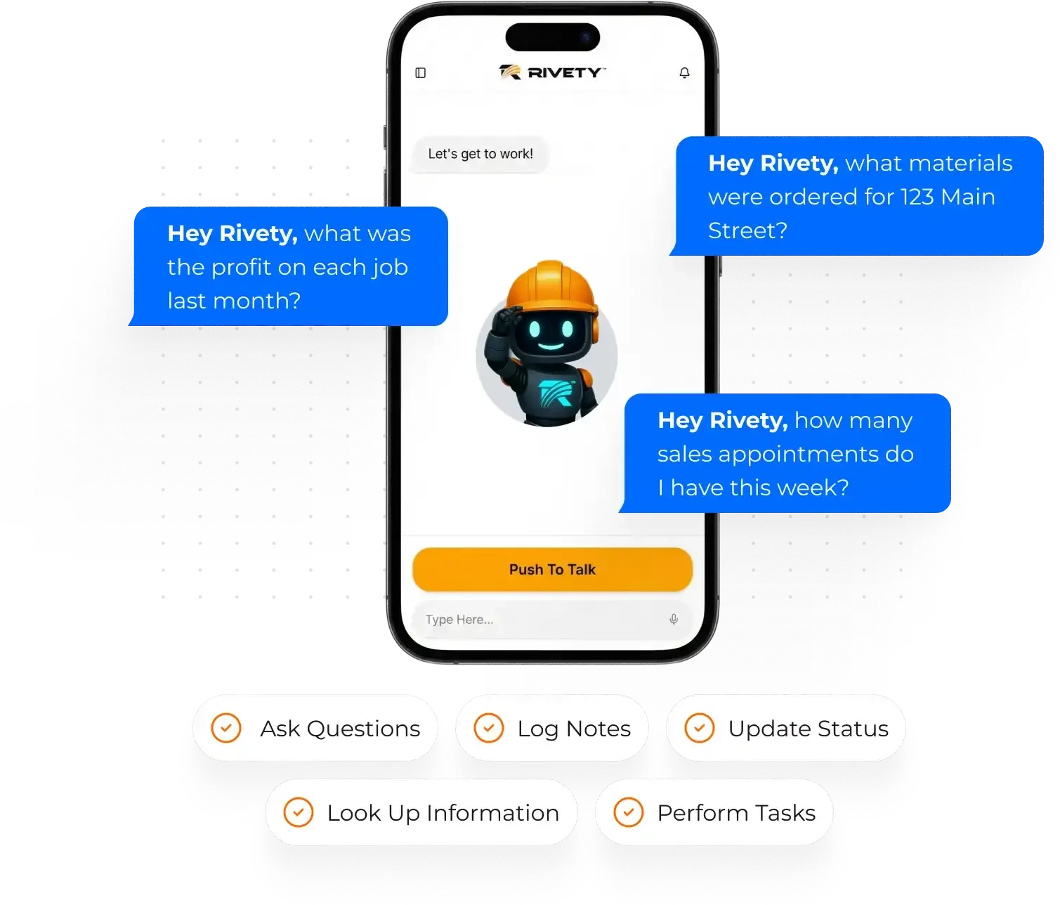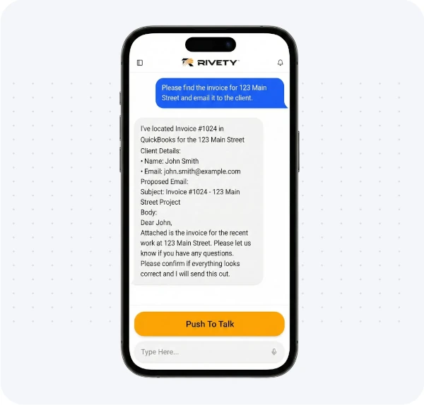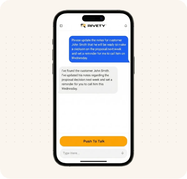 Rivety becomes a field-side assistant that pulls job details, updates the CRM, and completes admin tasks the moment reps ask. Stay focused on selling while Rivety takes care of the busywork.