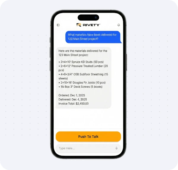 Rivety lets project managers access schedules, job statuses, materials, updates, and communication instantly from the field. They save hours each week by telling Rivety what they need done instead of going back to a computer to do it.