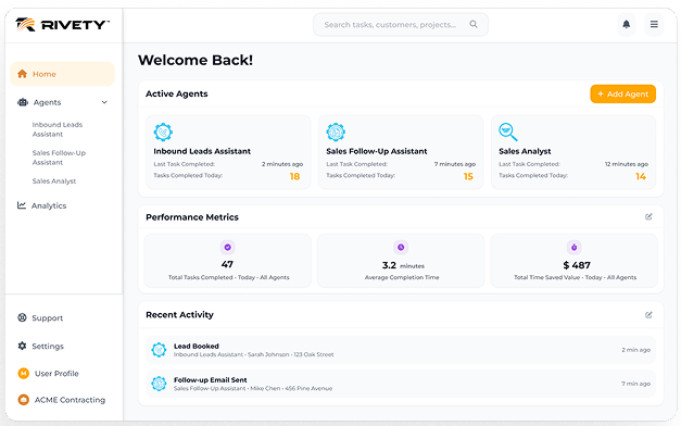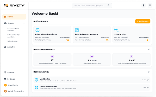 Managing AI Agents at Rivety is easy and powerful thanks to your personalized dashboard. Think of it as your command center, where you can view, interact with, and guide your digital team in real time.